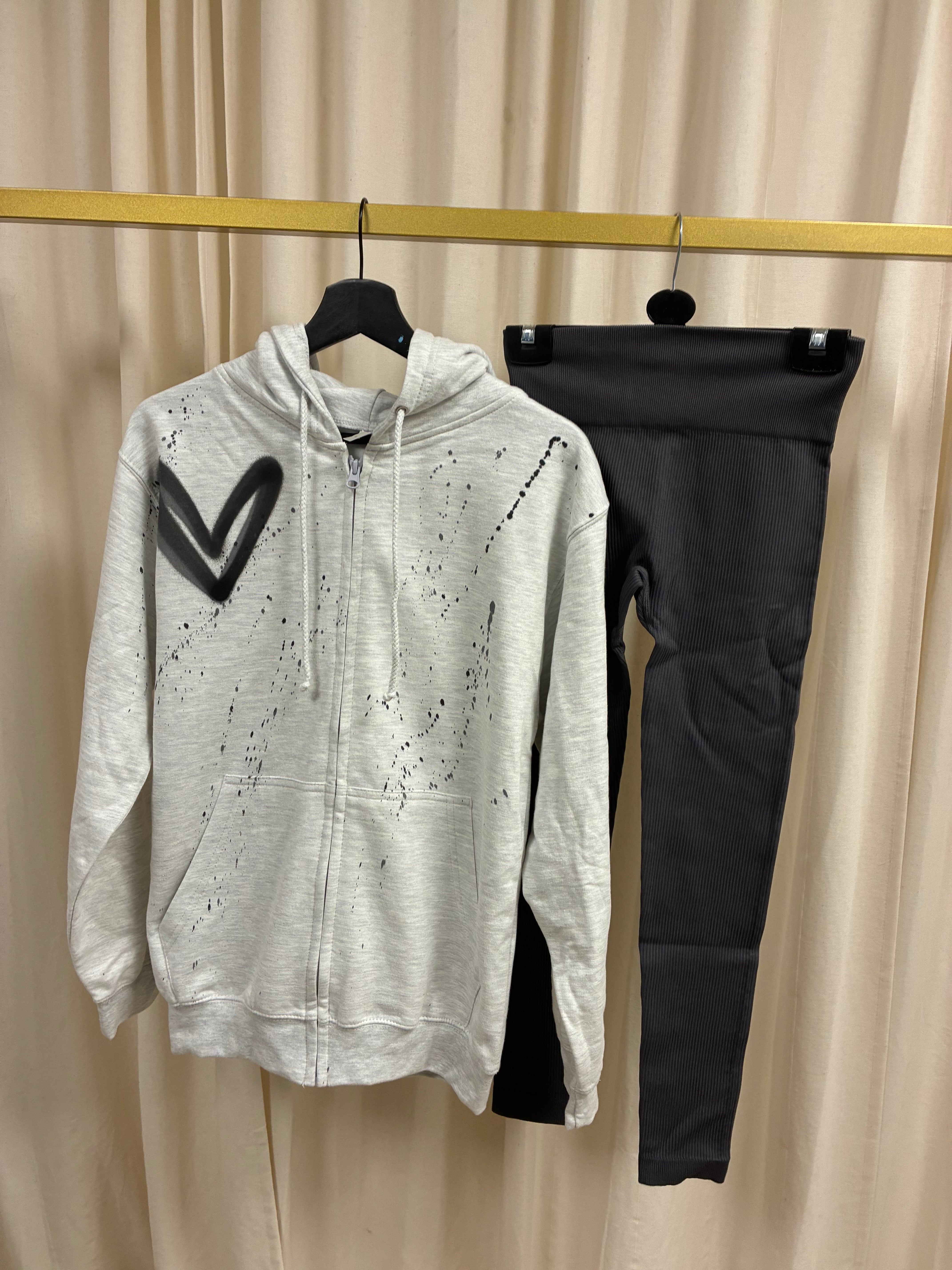 Charcoal Grey Hearts Spray Painted Zip Up Ash Grey Hoodie & Leggings Adults
