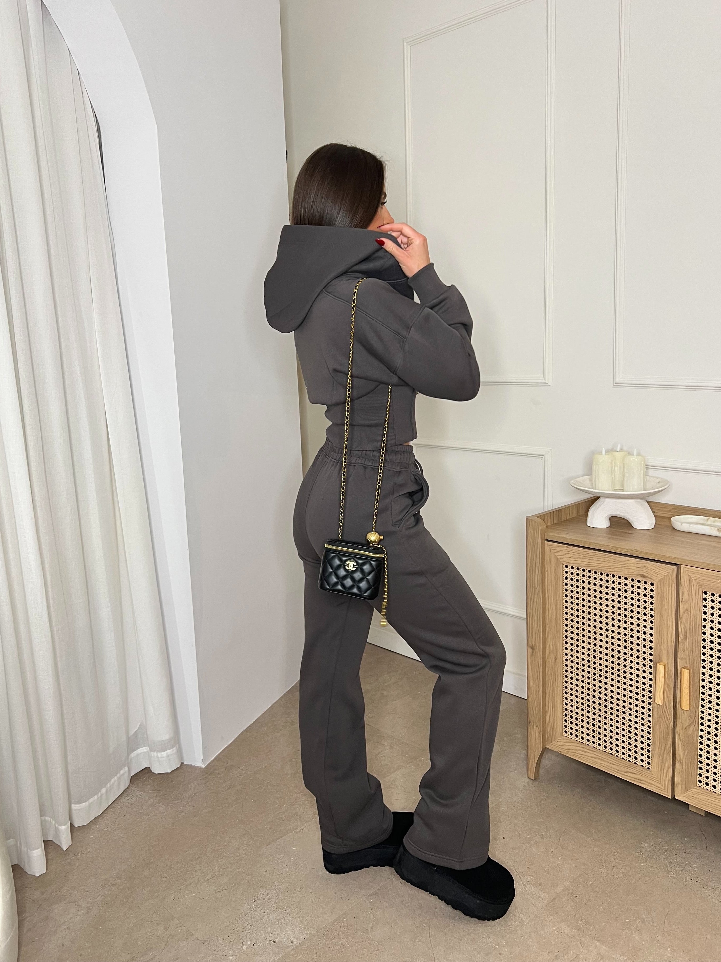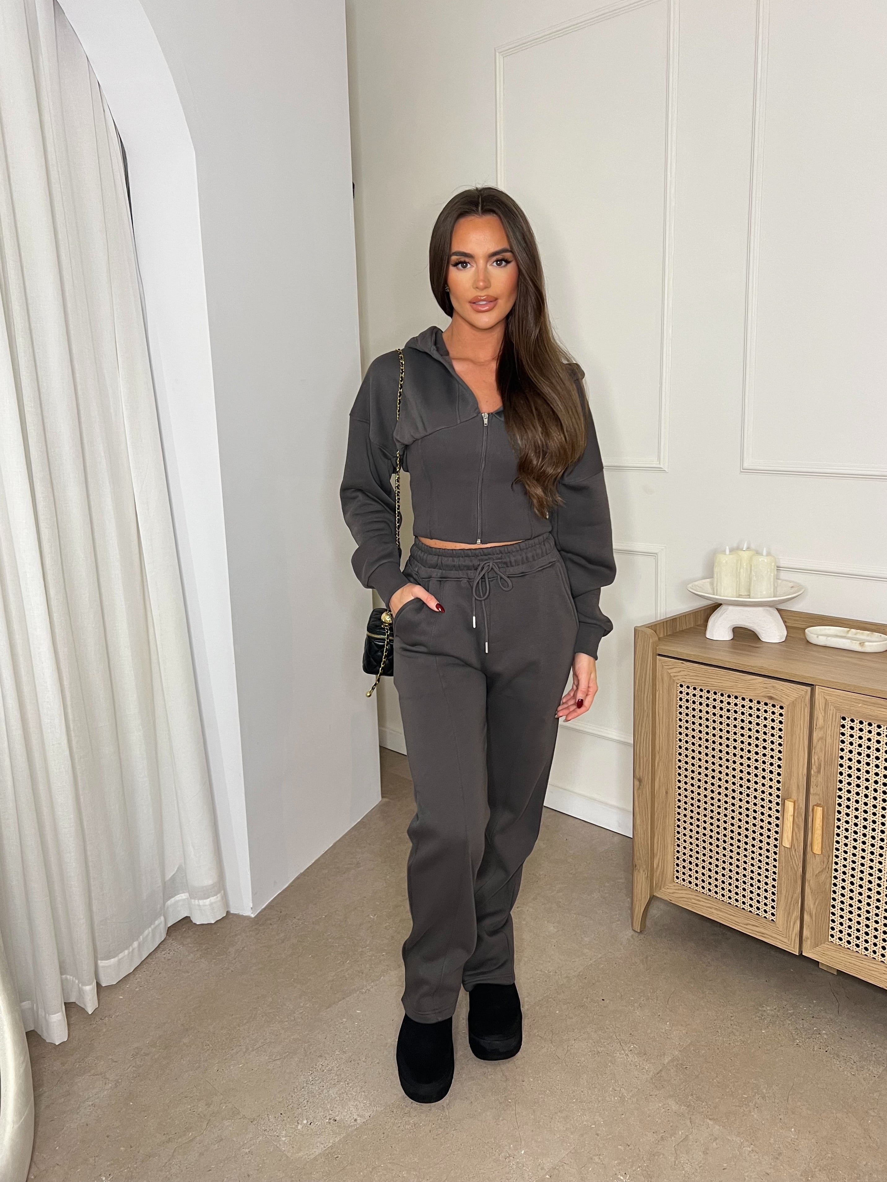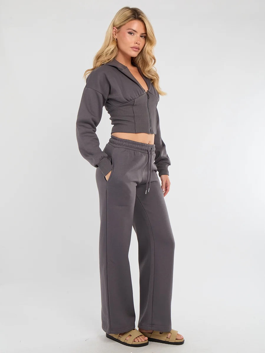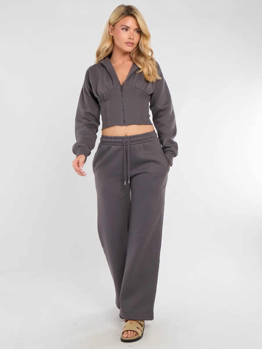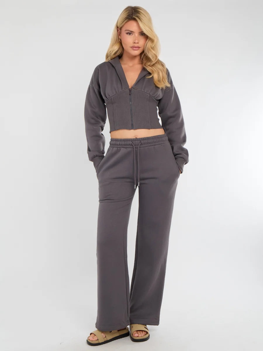 Cropped Zip Up Hood Sweatshirt & Wide Leg Trouser Tracksuit Charcoal