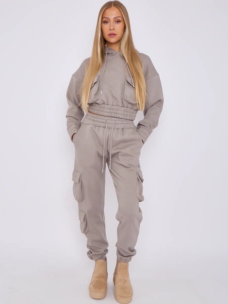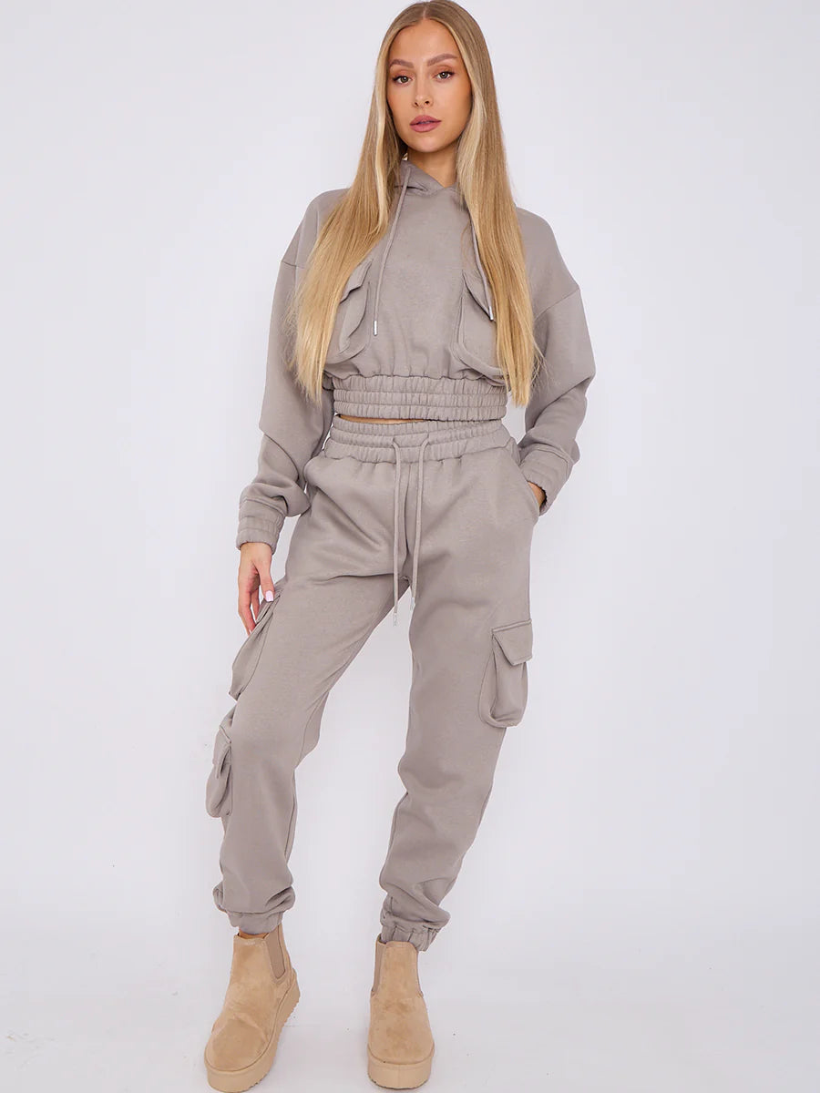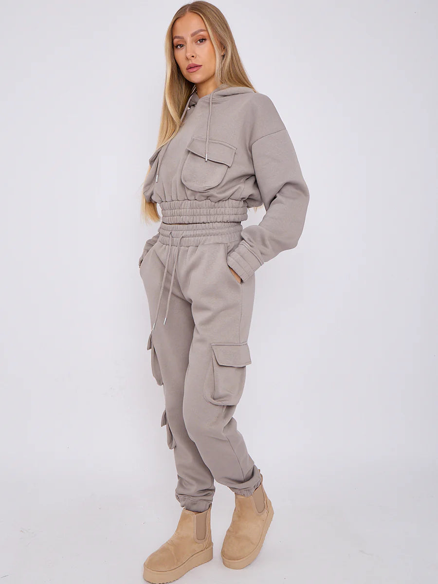 Cargo Pockets Fleece Tracksuit Fleece Cargo Pockets Cropped Hoodie Hood With Functional Drawstring Joggers Elasticated Waist With Functional Drawstring Co-ordinate...
