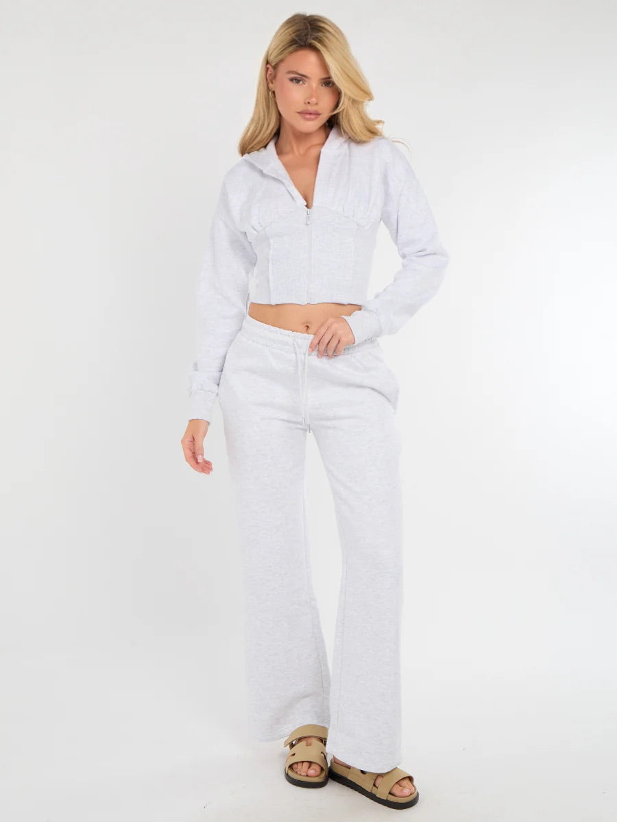 Cropped Zip Up Hood Sweatshirt & Wide Leg Trouser Tracksuit Ash Grey