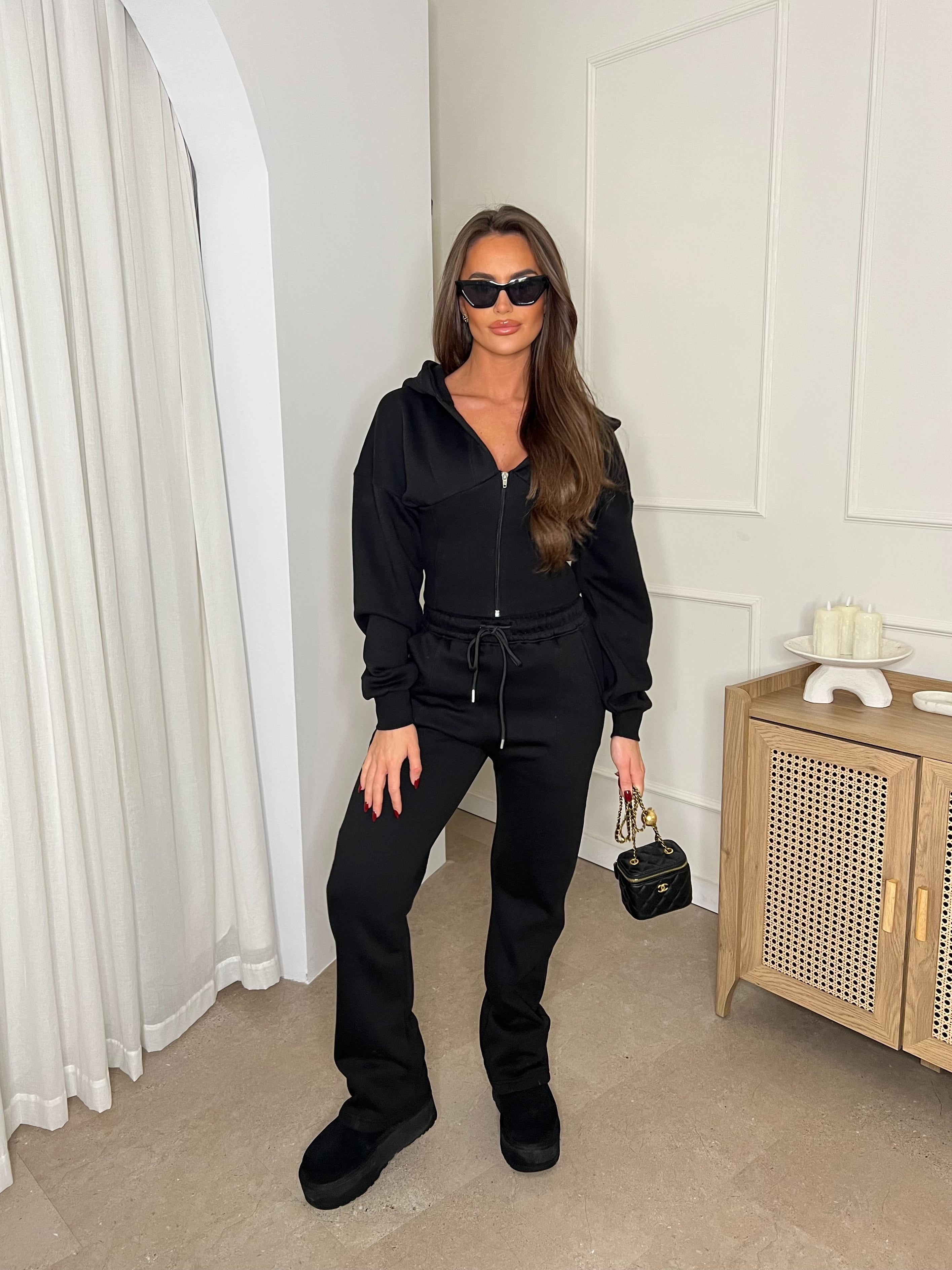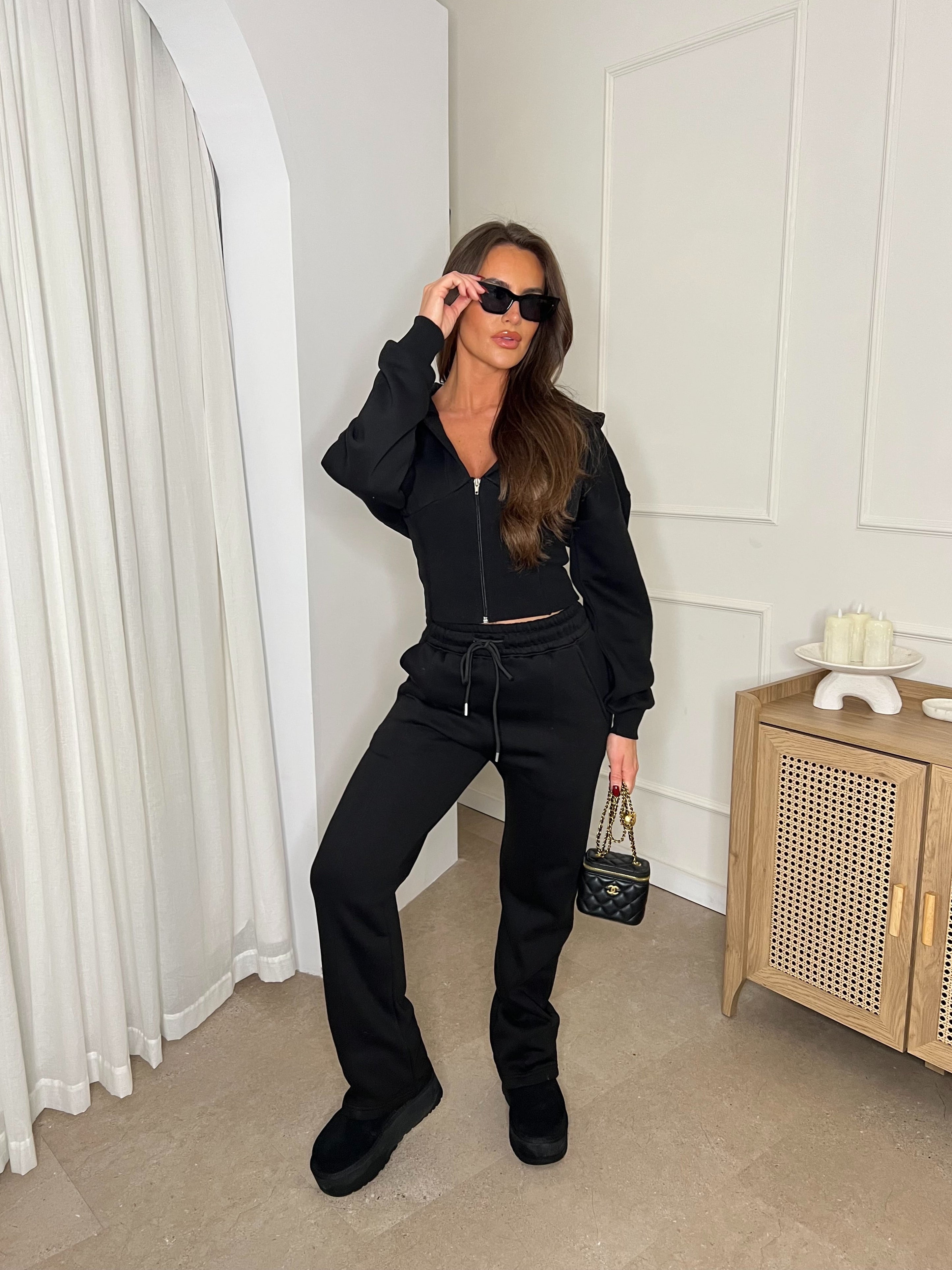 Cropped Zip Up Hood Sweatshirt & Wide Leg Trouser Tracksuit Black