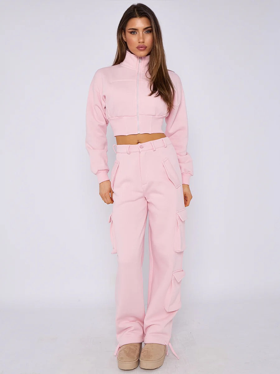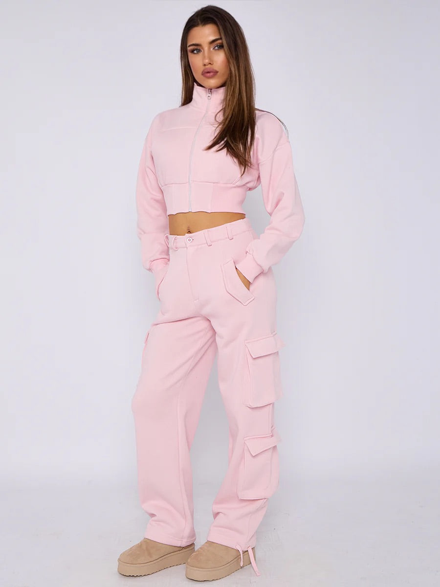 Cropped Zip Up Sweatshirt & Cargo Trouser Tracksuit Pink