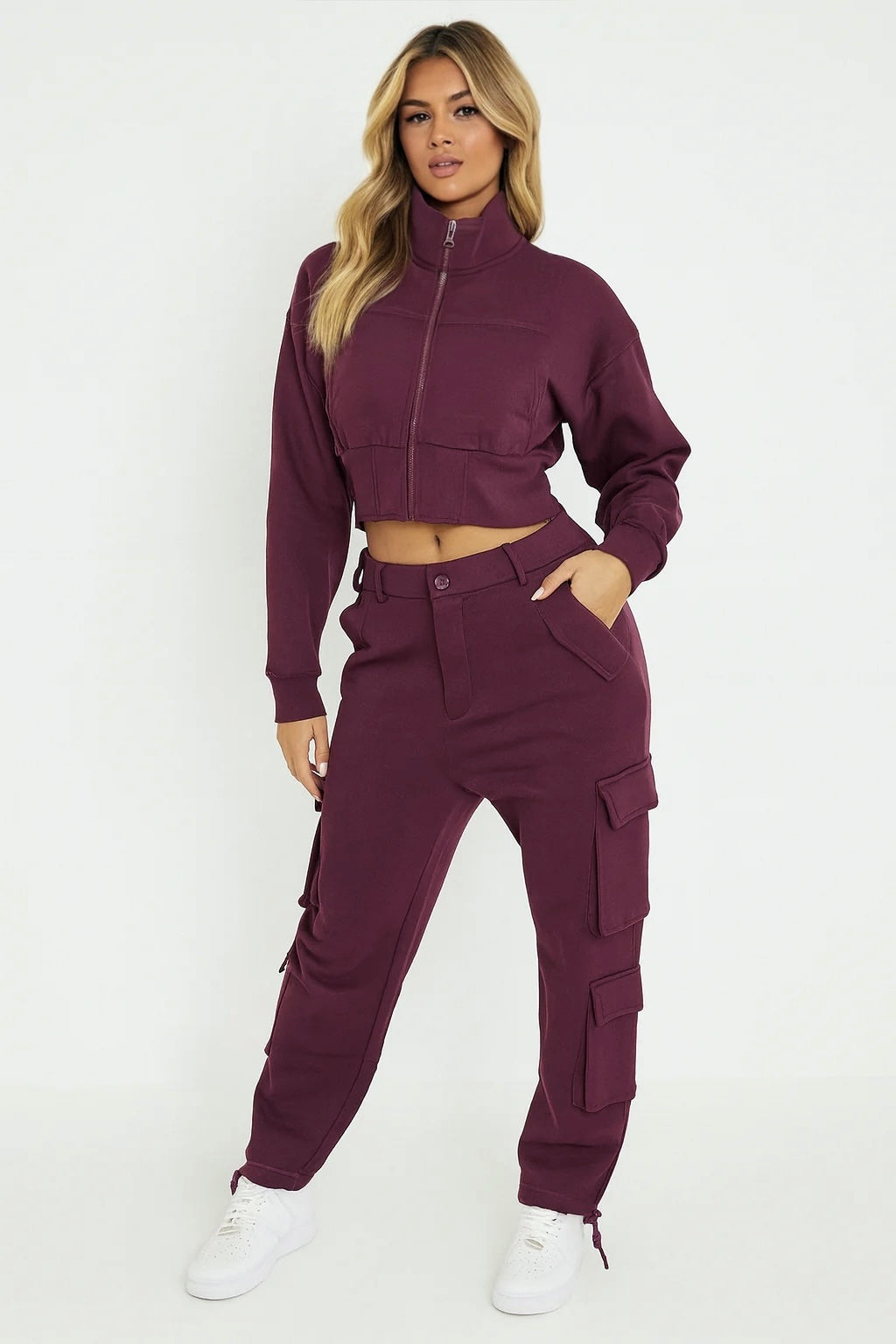 Cropped Zip Up Sweatshirt & Cargo Trouser Tracksuit Burgundy