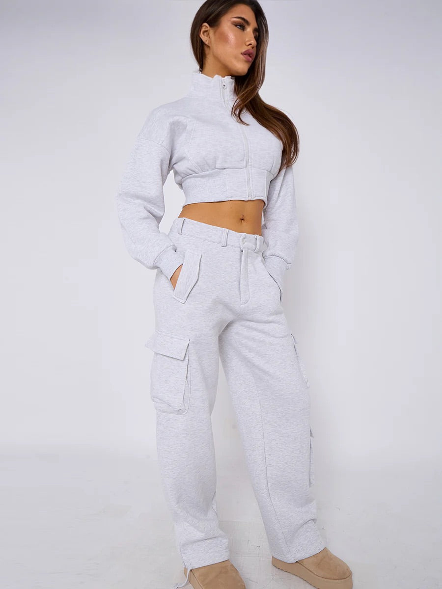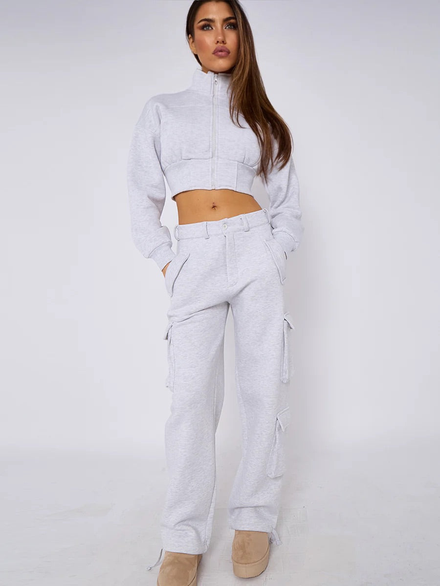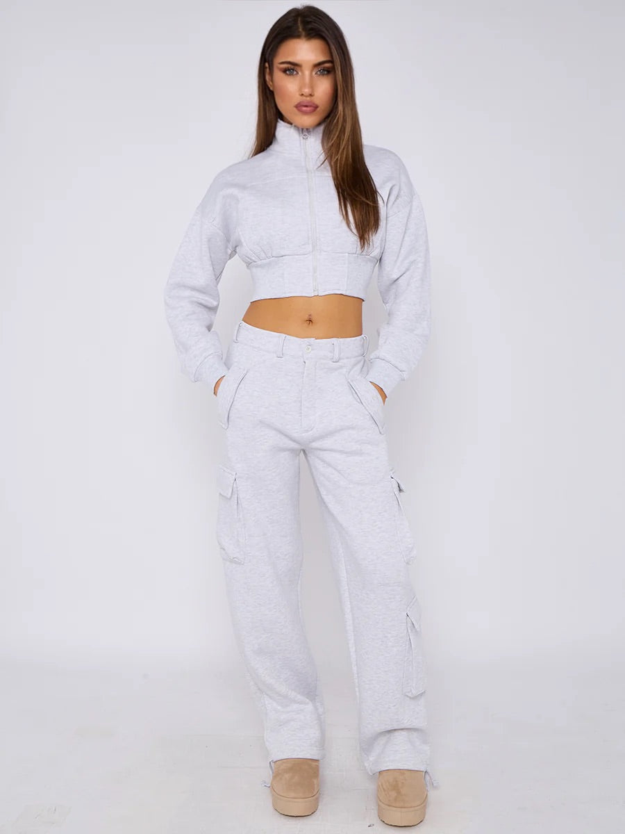 Cropped Zip Up Sweatshirt & Cargo Trouser Tracksuit Ash Grey