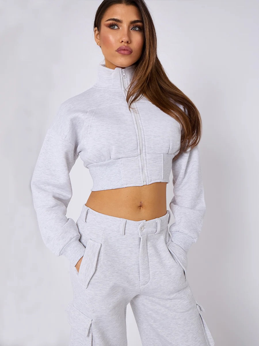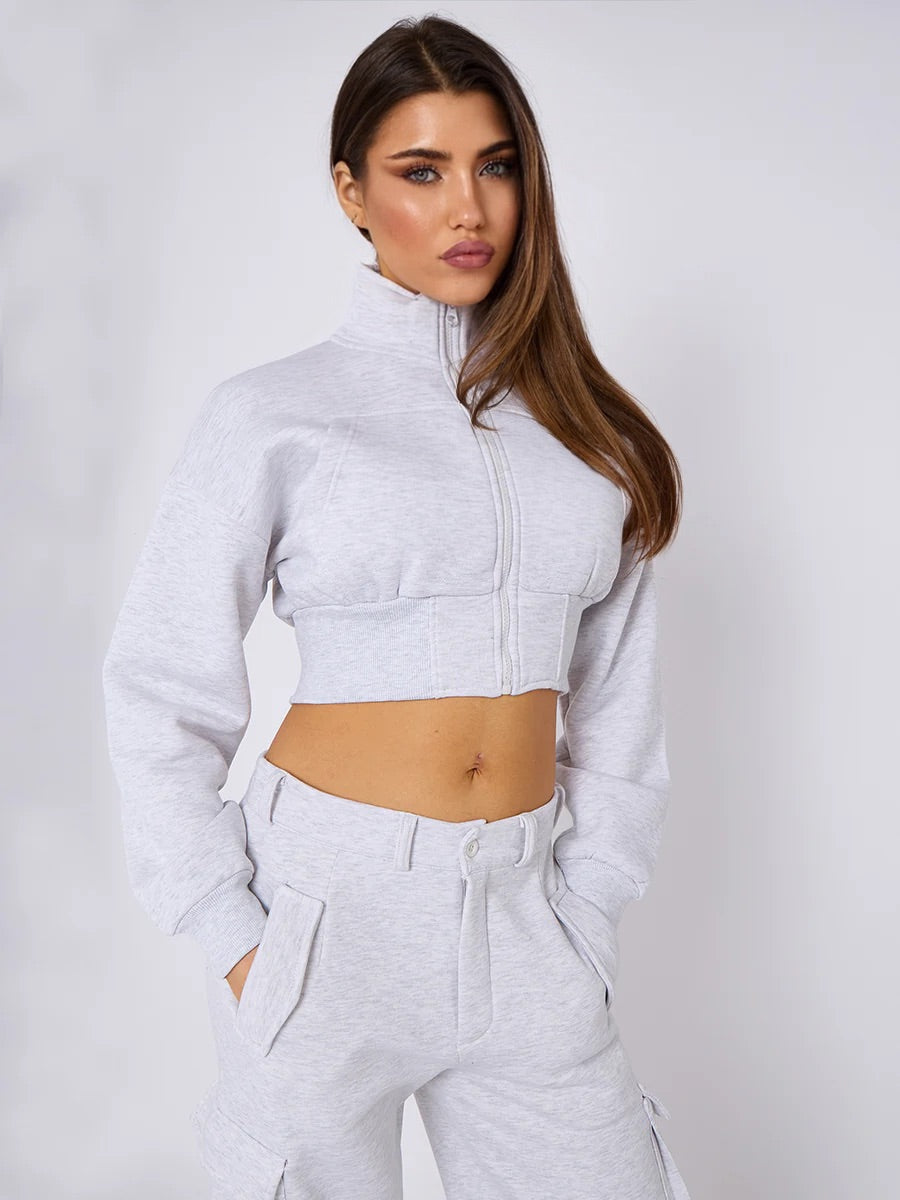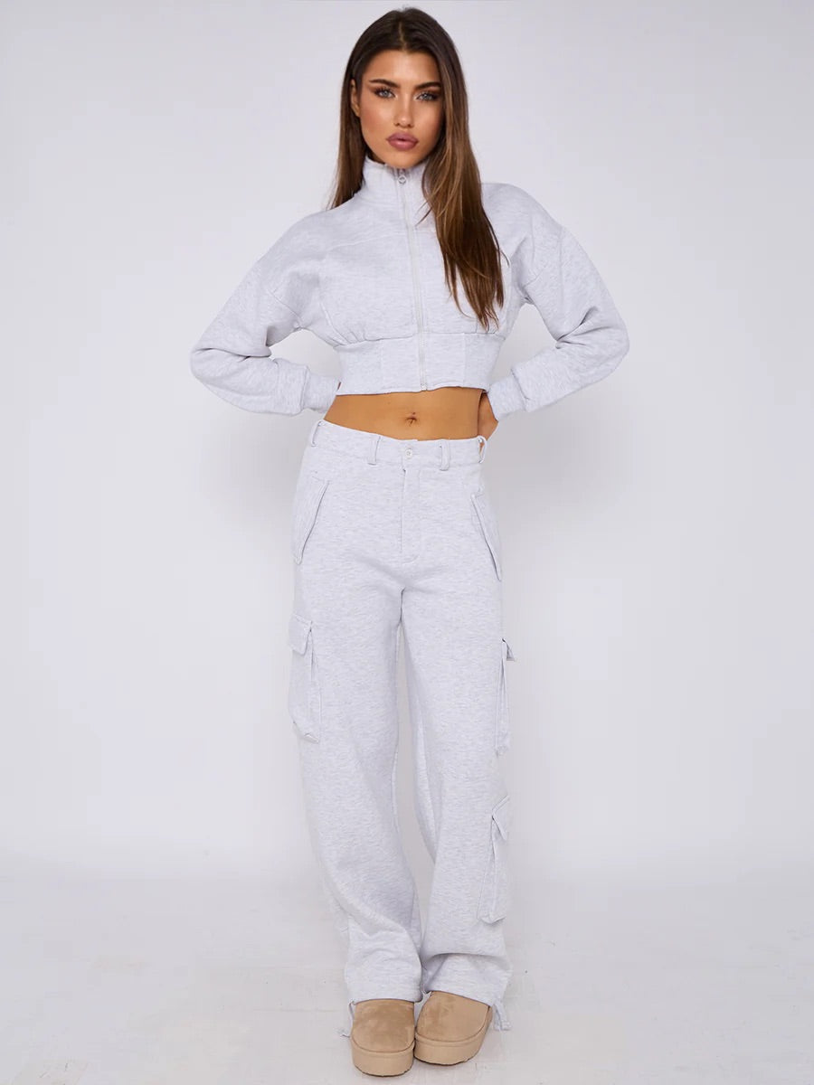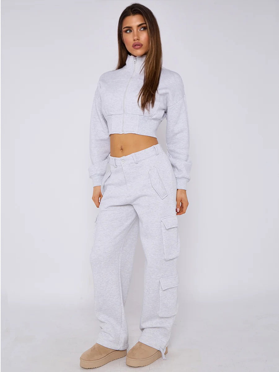 Cropped Zip Up Sweatshirt & Cargo Trouser Tracksuit Ash Grey