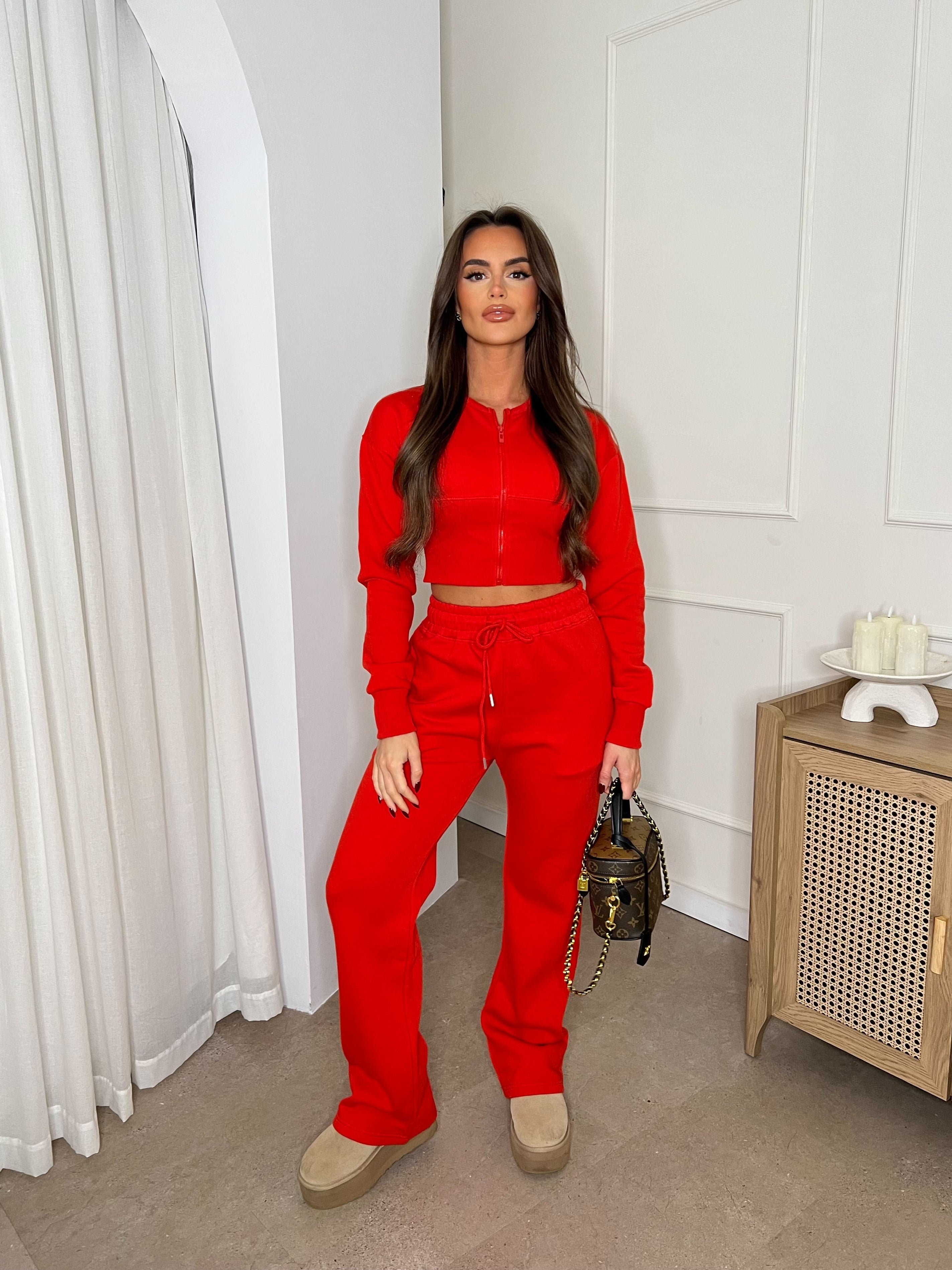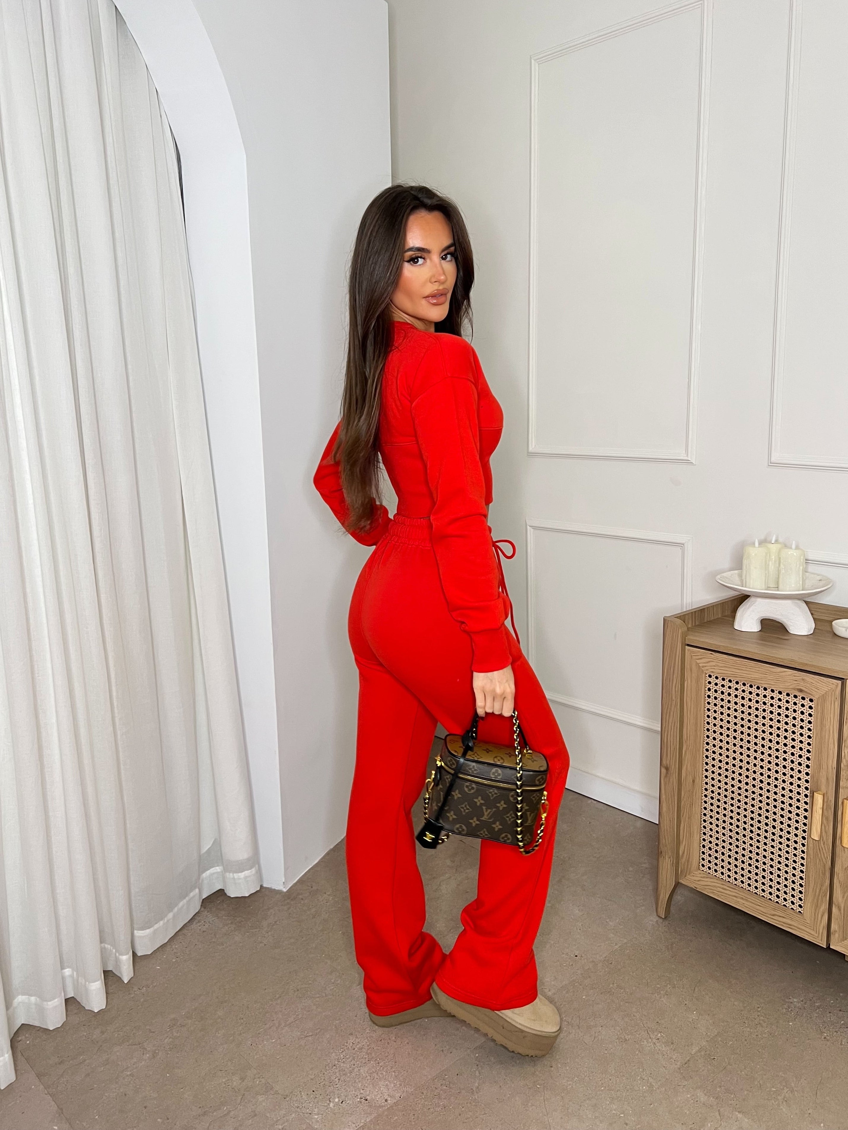 Cropped Zip Up Sweatshirt & Wide Leg Trouser Tracksuit Red