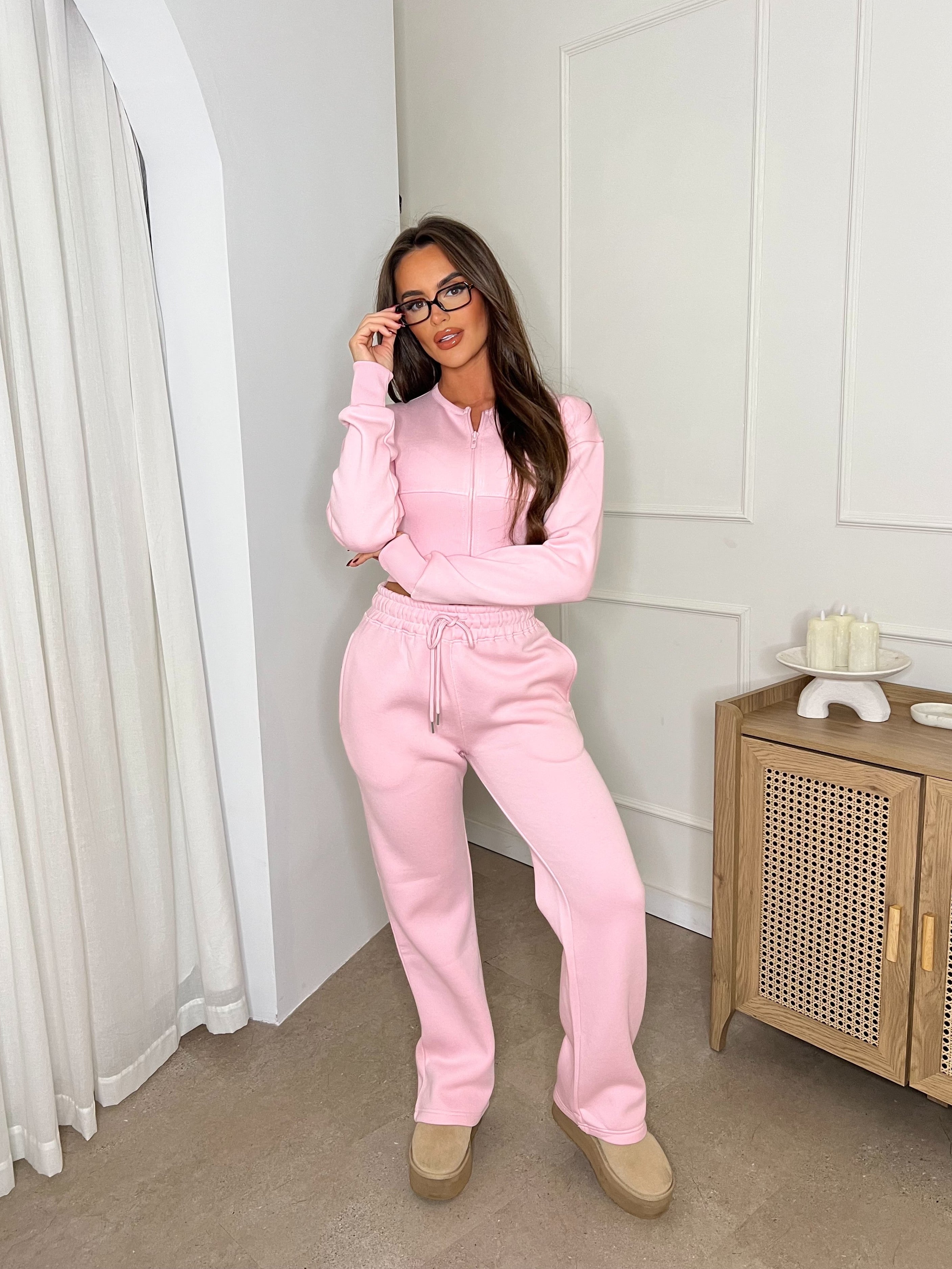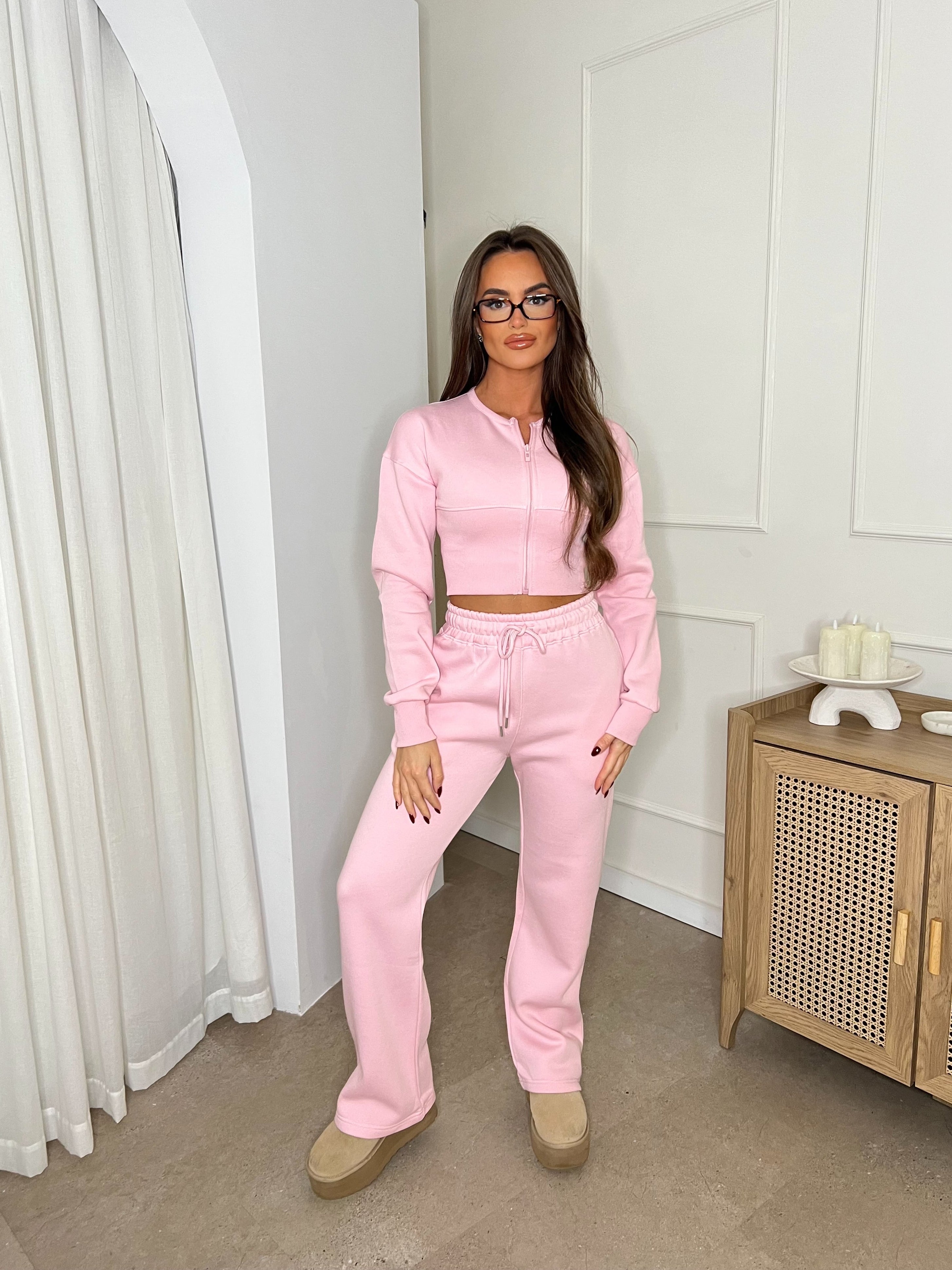 Cropped Zip Up Sweatshirt & Wide Leg Trouser Tracksuit Pink
