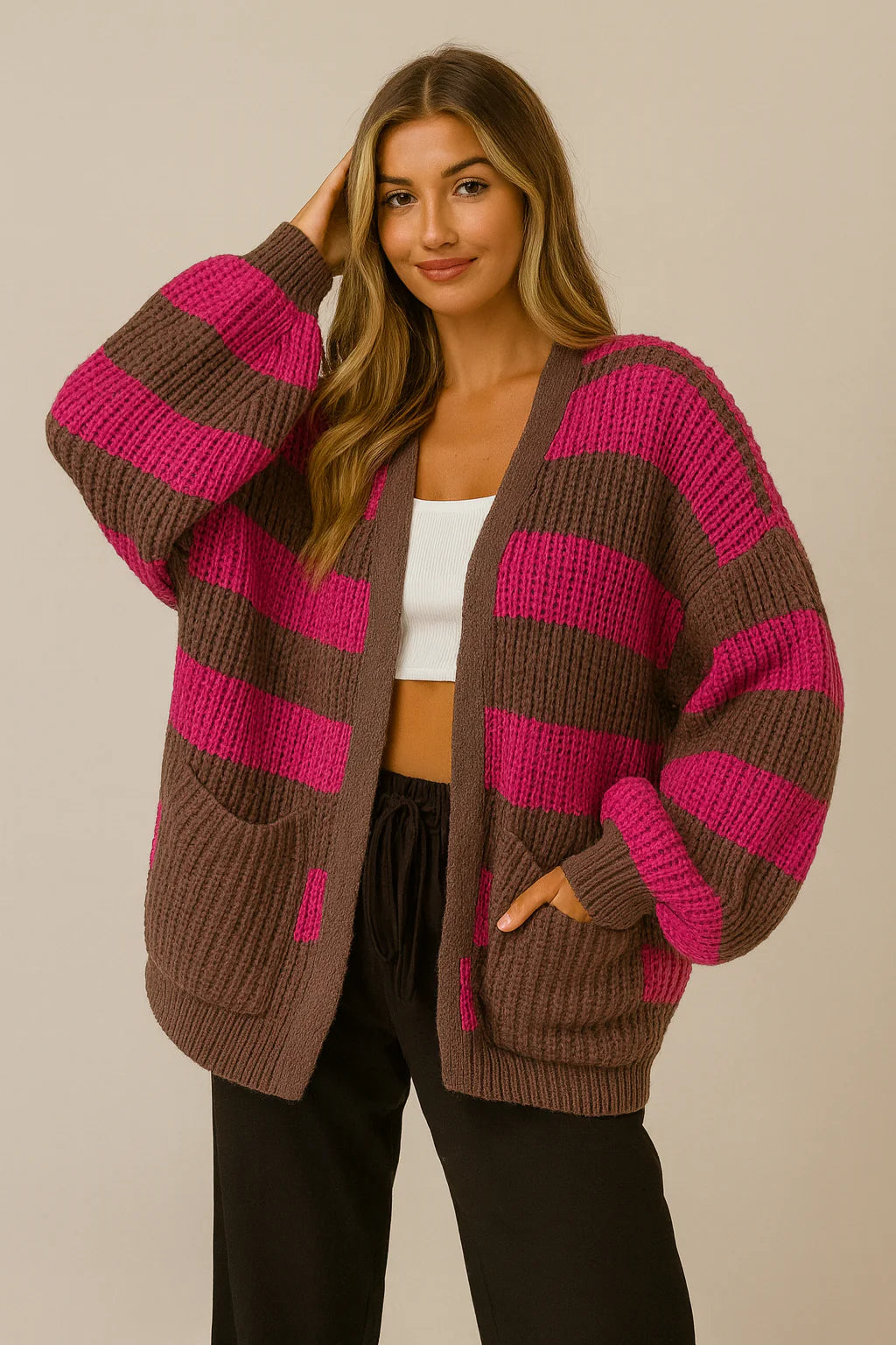 Balloon Sleeves Striped Open Cardigan Printed Knitted Balloon Sleeve Cardigan 100% Acrylic Made In UK