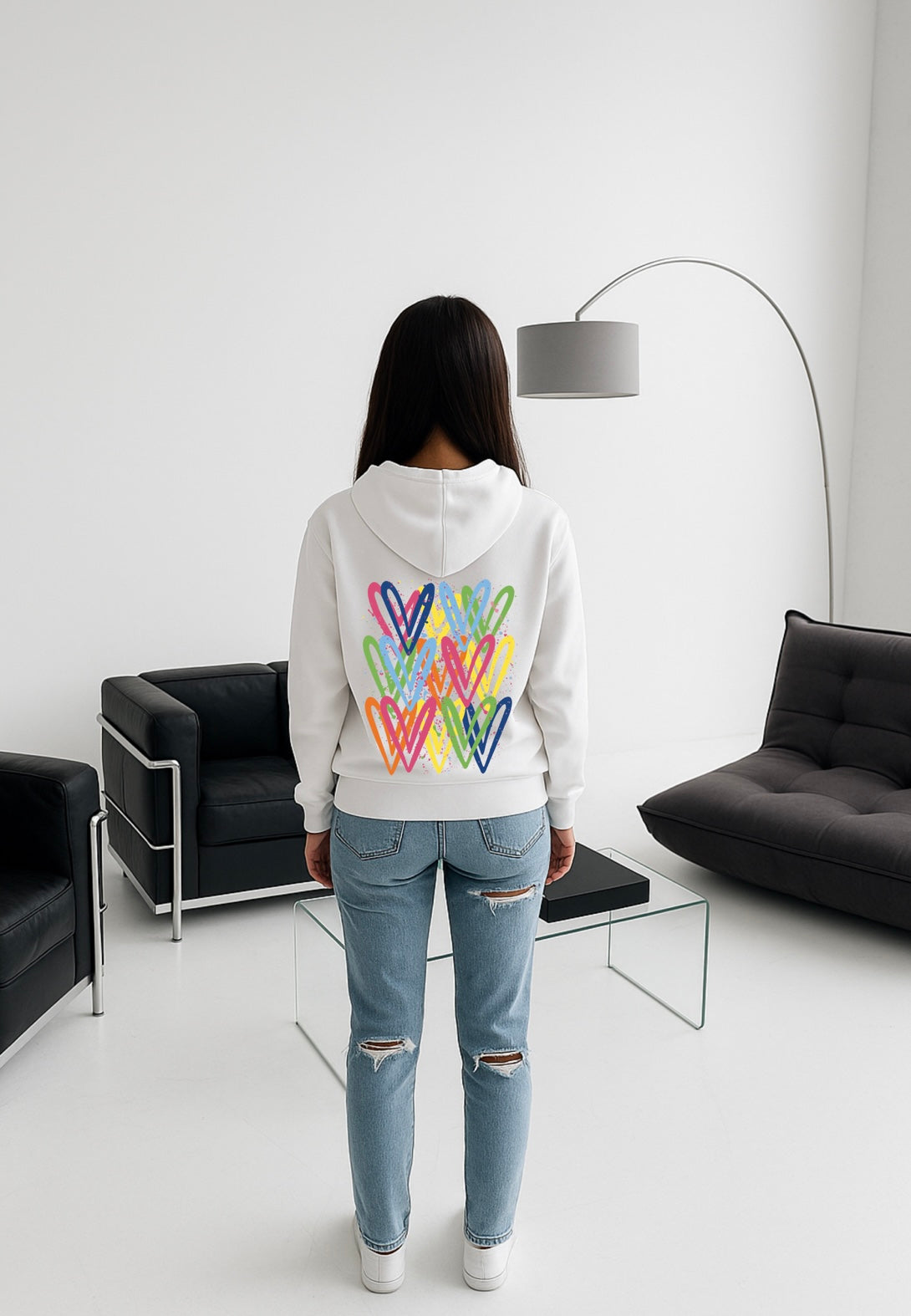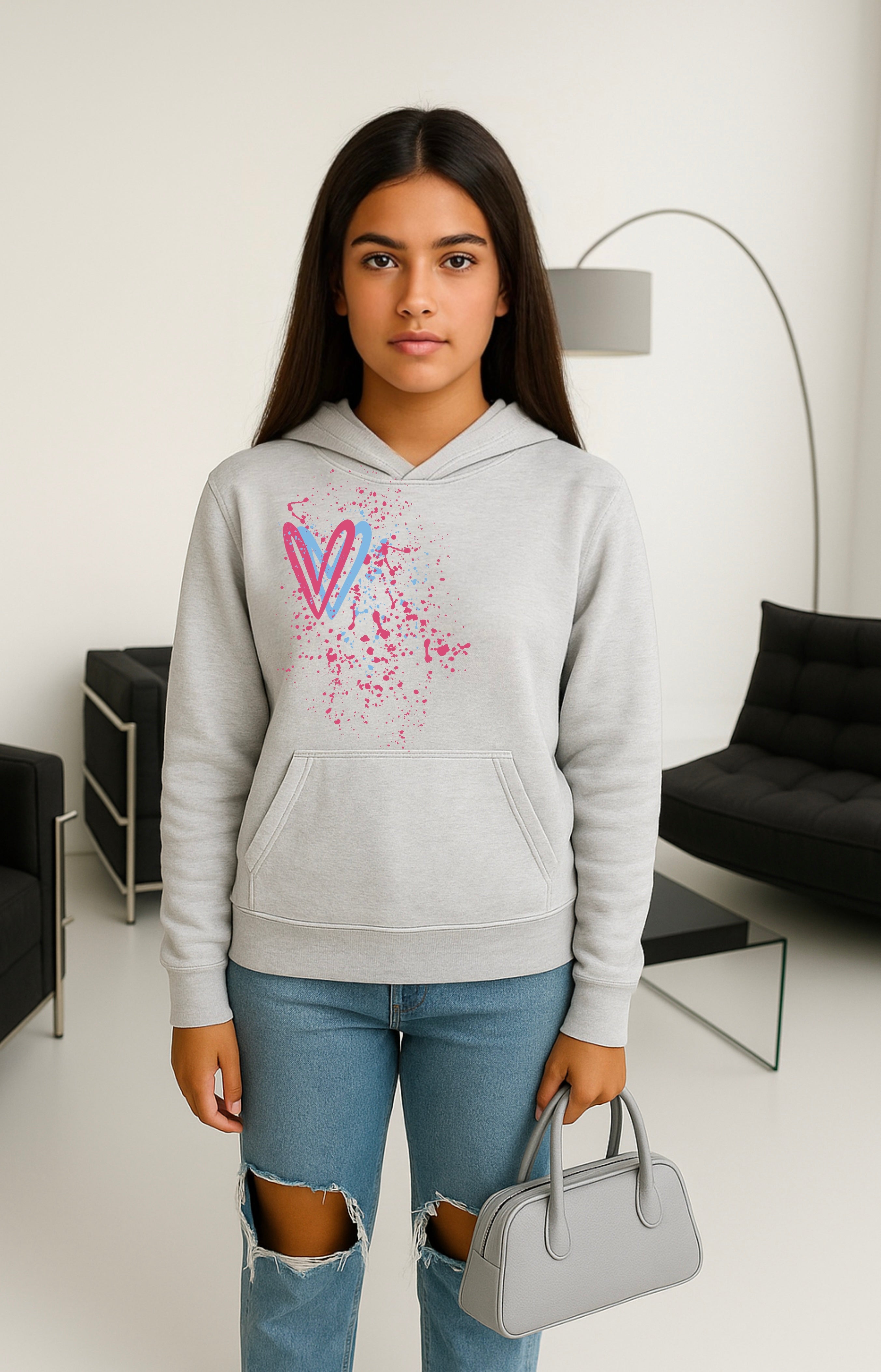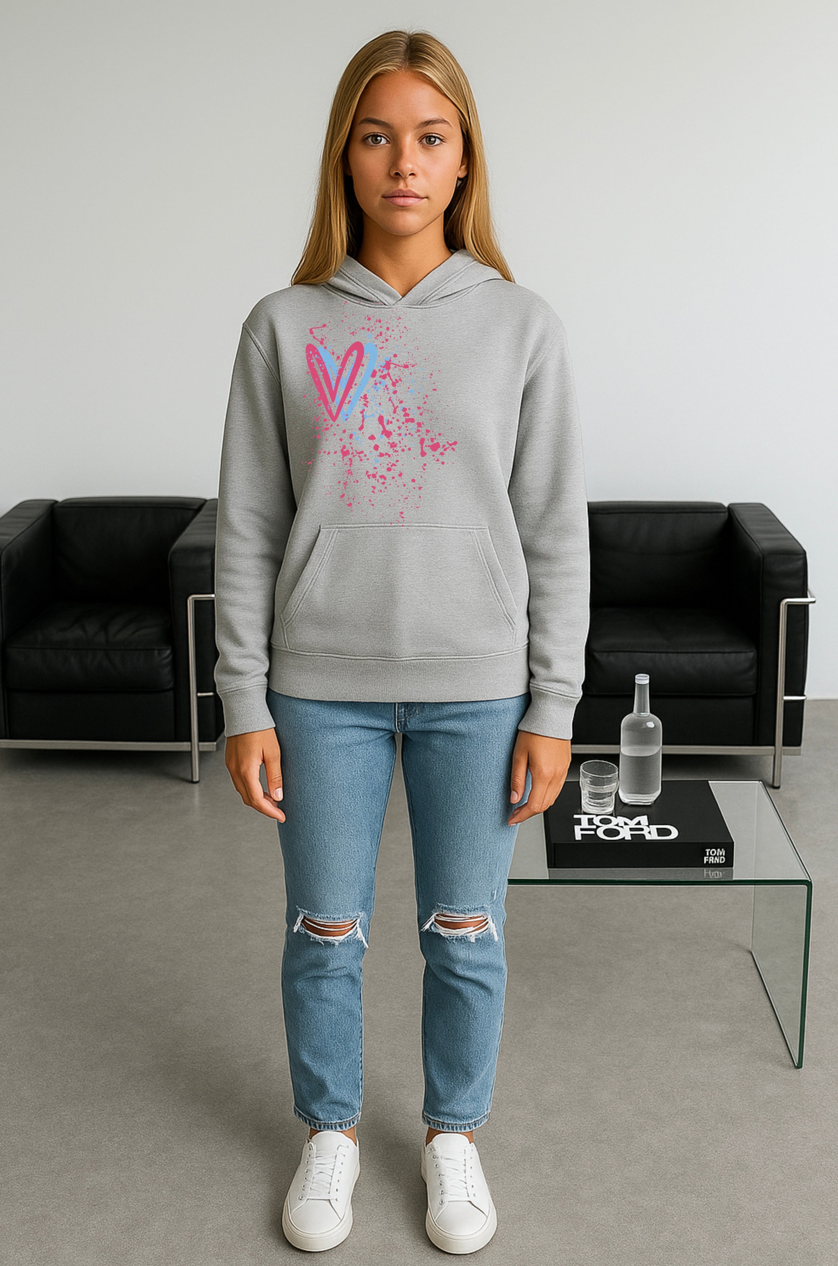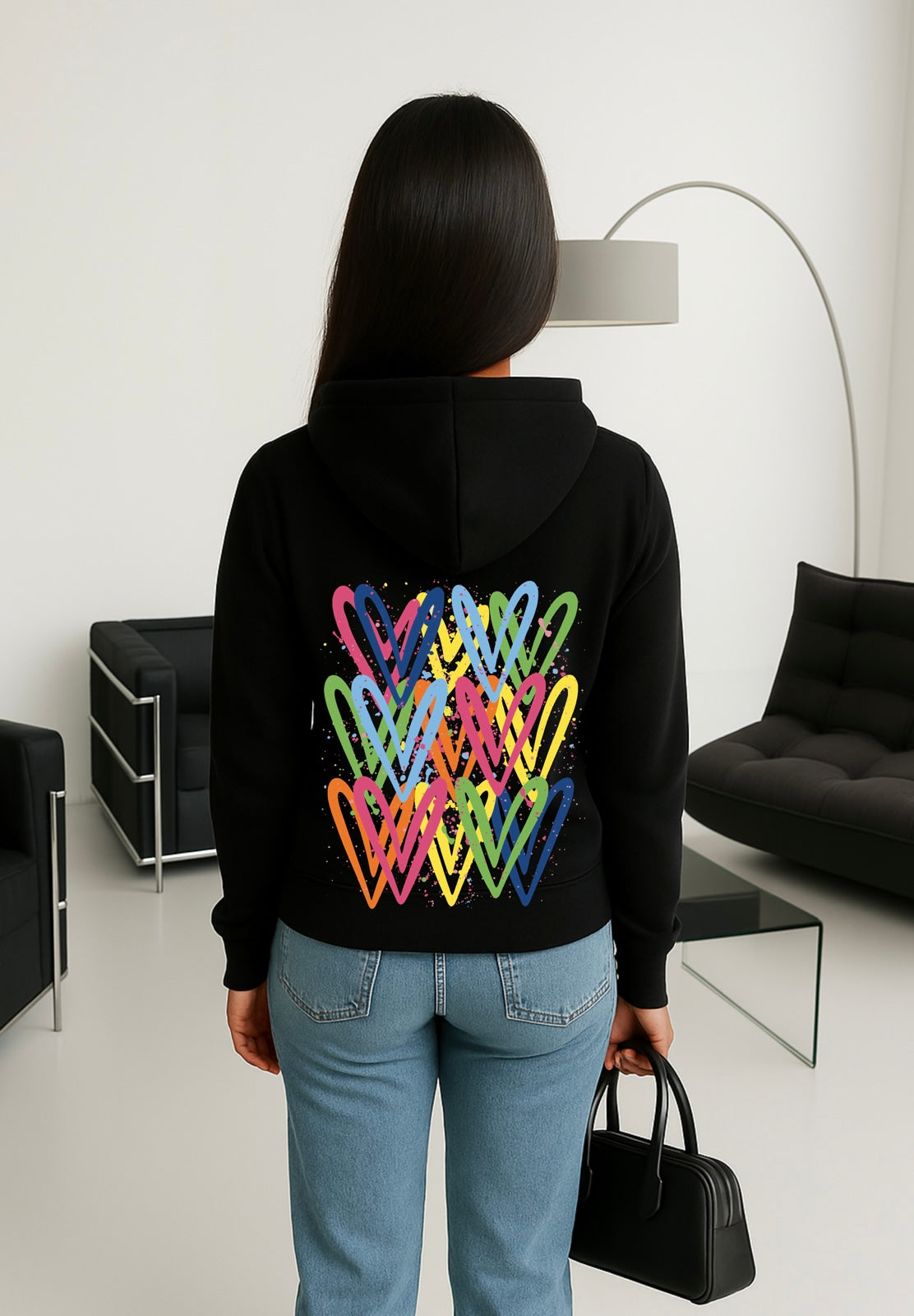 Introducing the Miss Runway graffiti Heart Hoodie, a unique and eye-catching addition to your wardrobe. This Hoodie features a one-of-a-kind design that is sure to turn heads. This Hoodie is perfect for those who want to make a statement with their fashion choices.