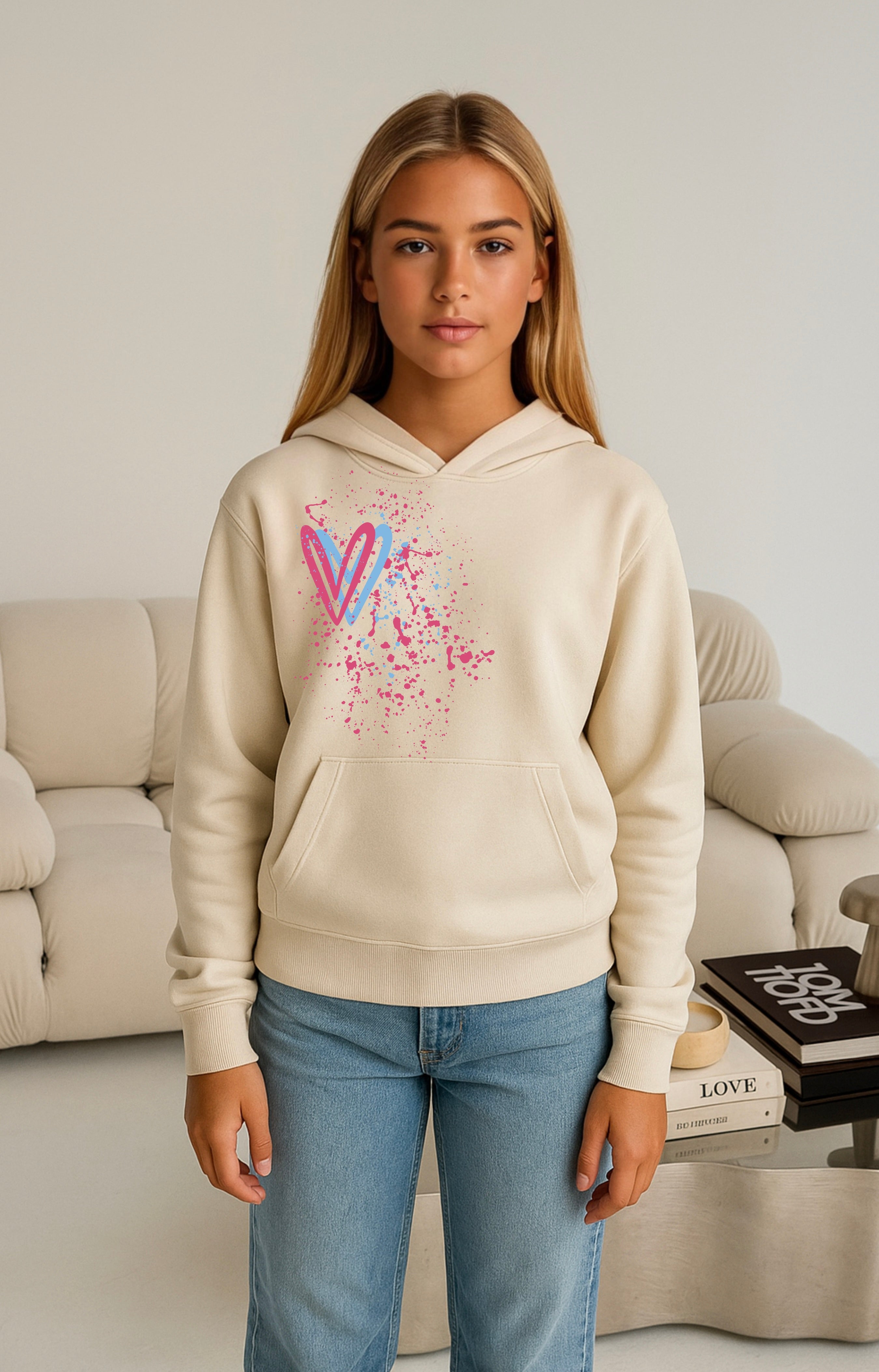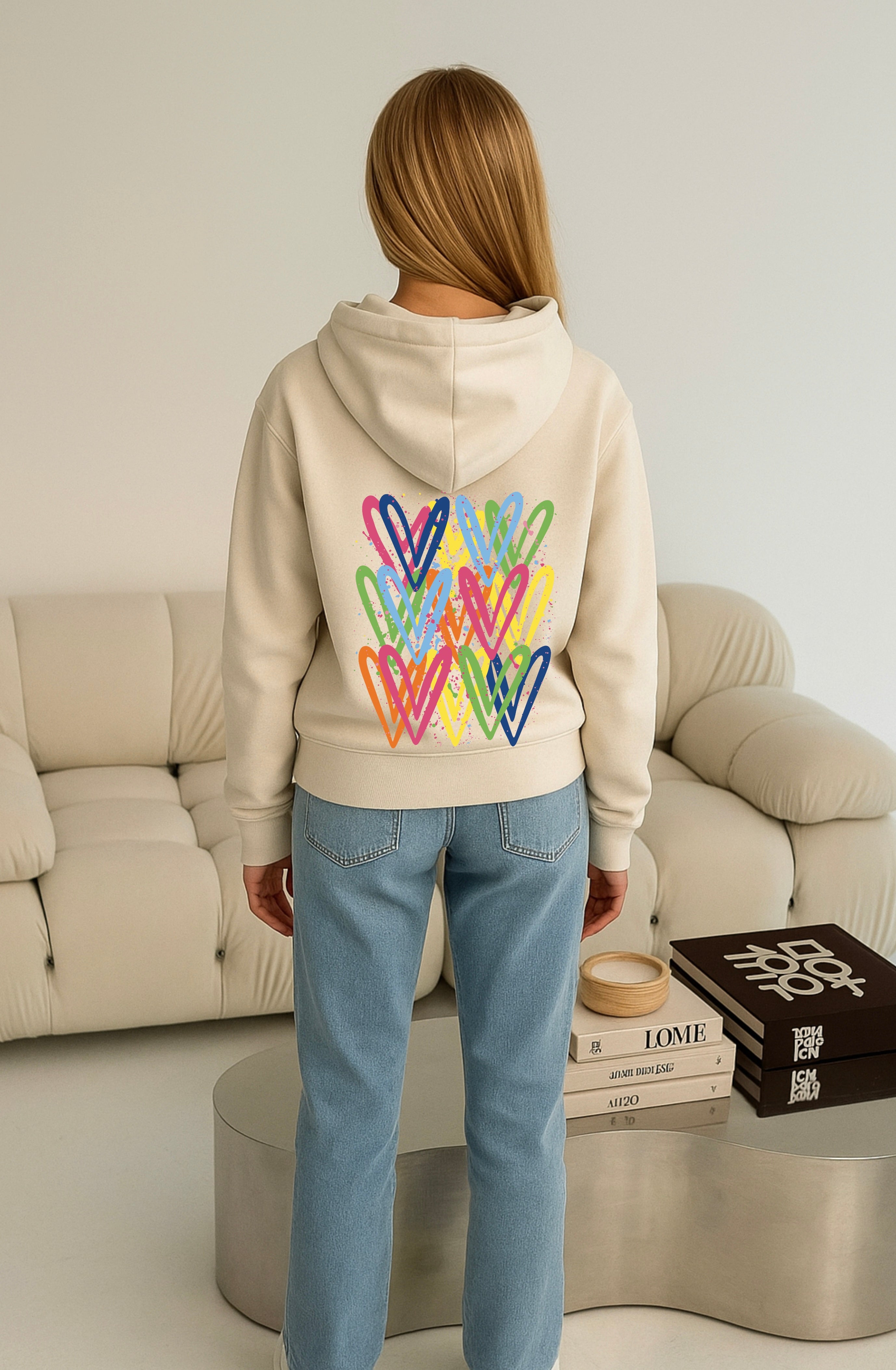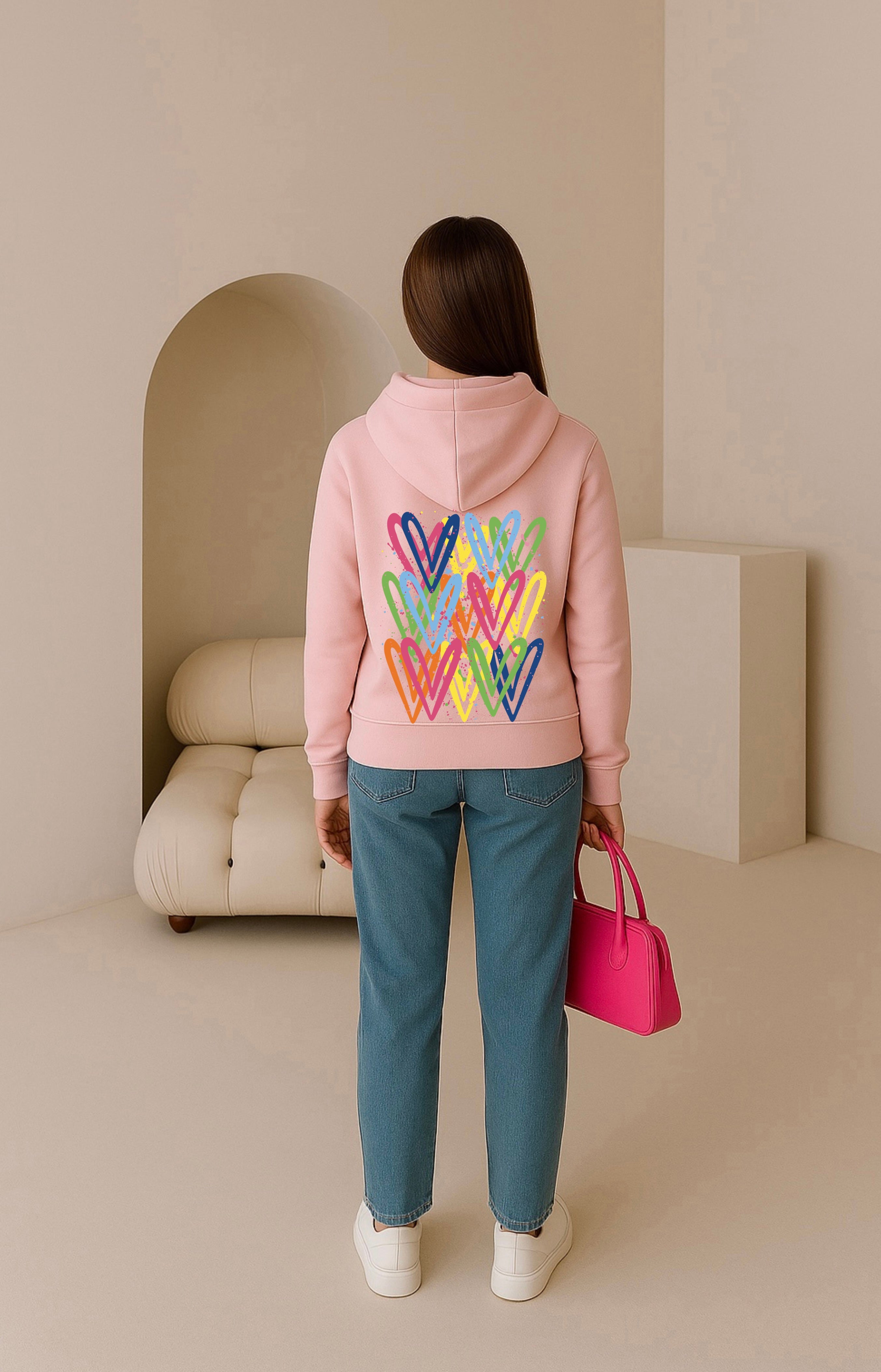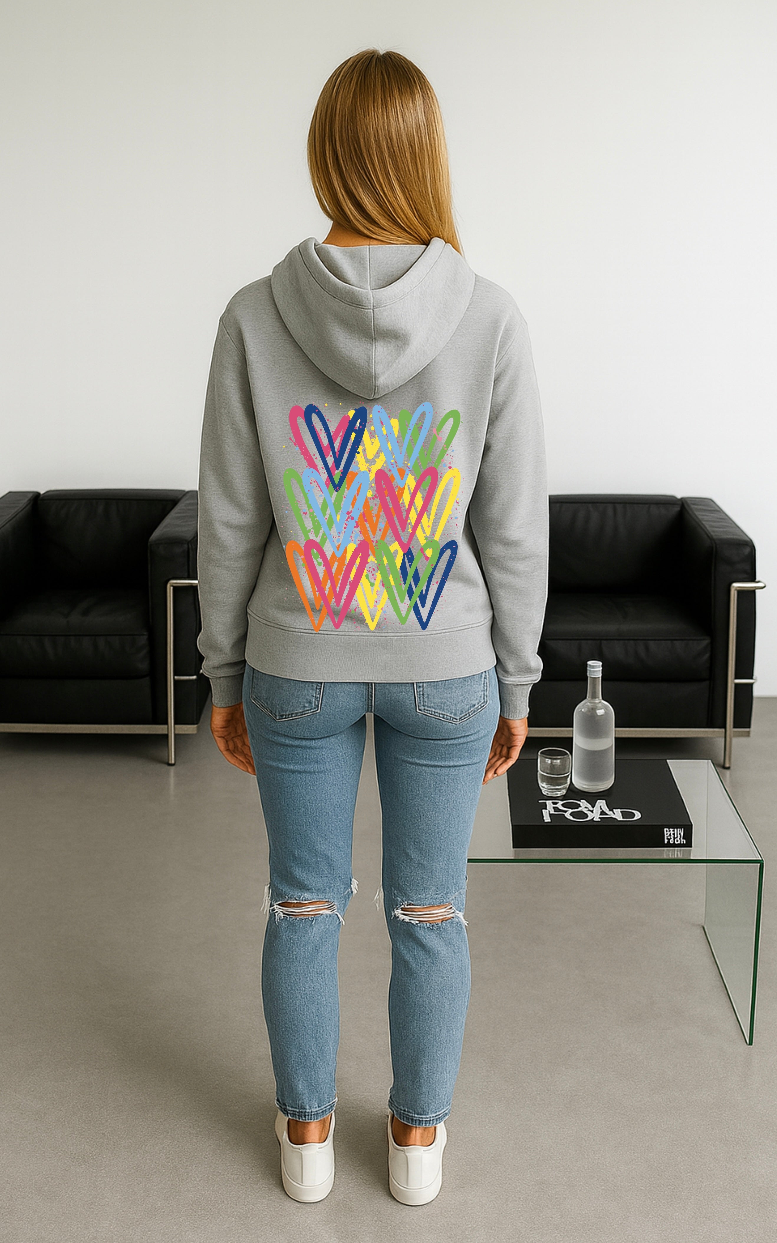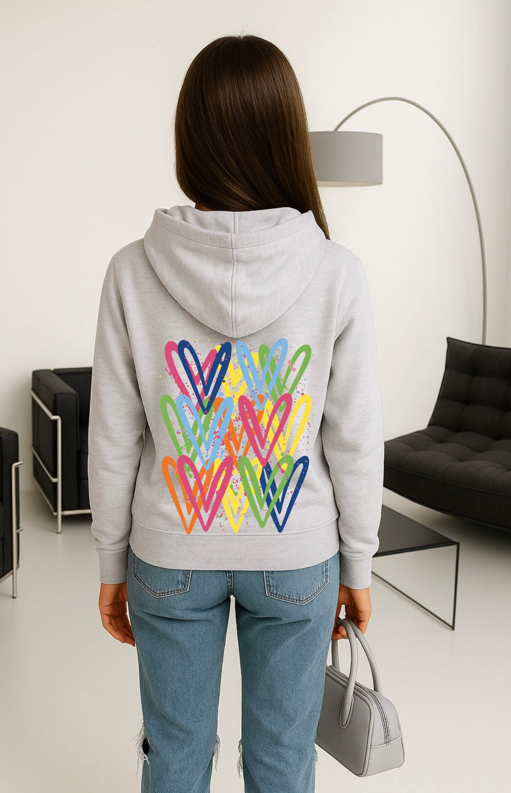 Introducing the Miss Runway graffiti Heart Hoodie, a unique and eye-catching addition to your wardrobe. This Hoodie features a one-of-a-kind design that is sure to turn heads. This Hoodie is perfect for those who want to make a statement with their fashion choices.