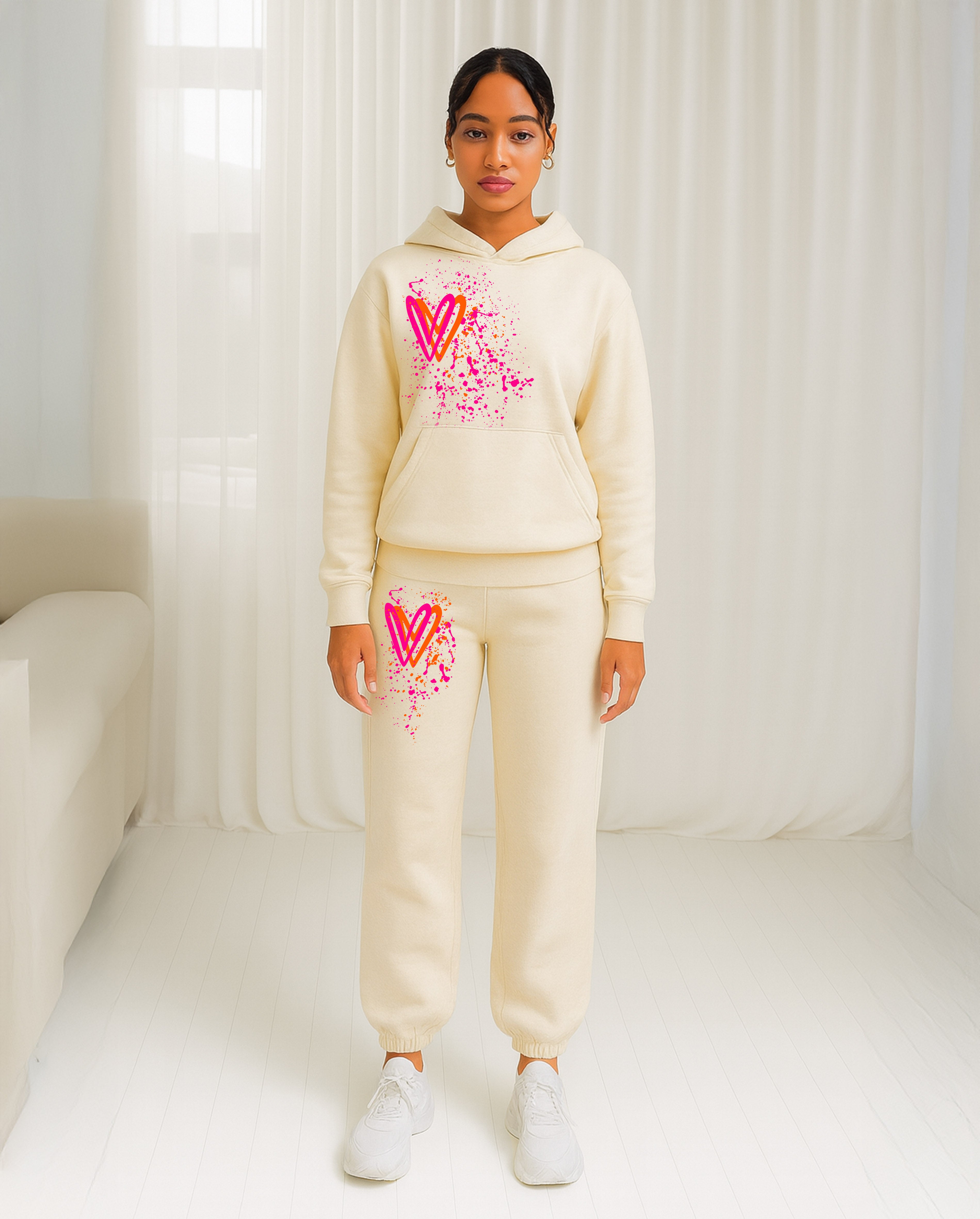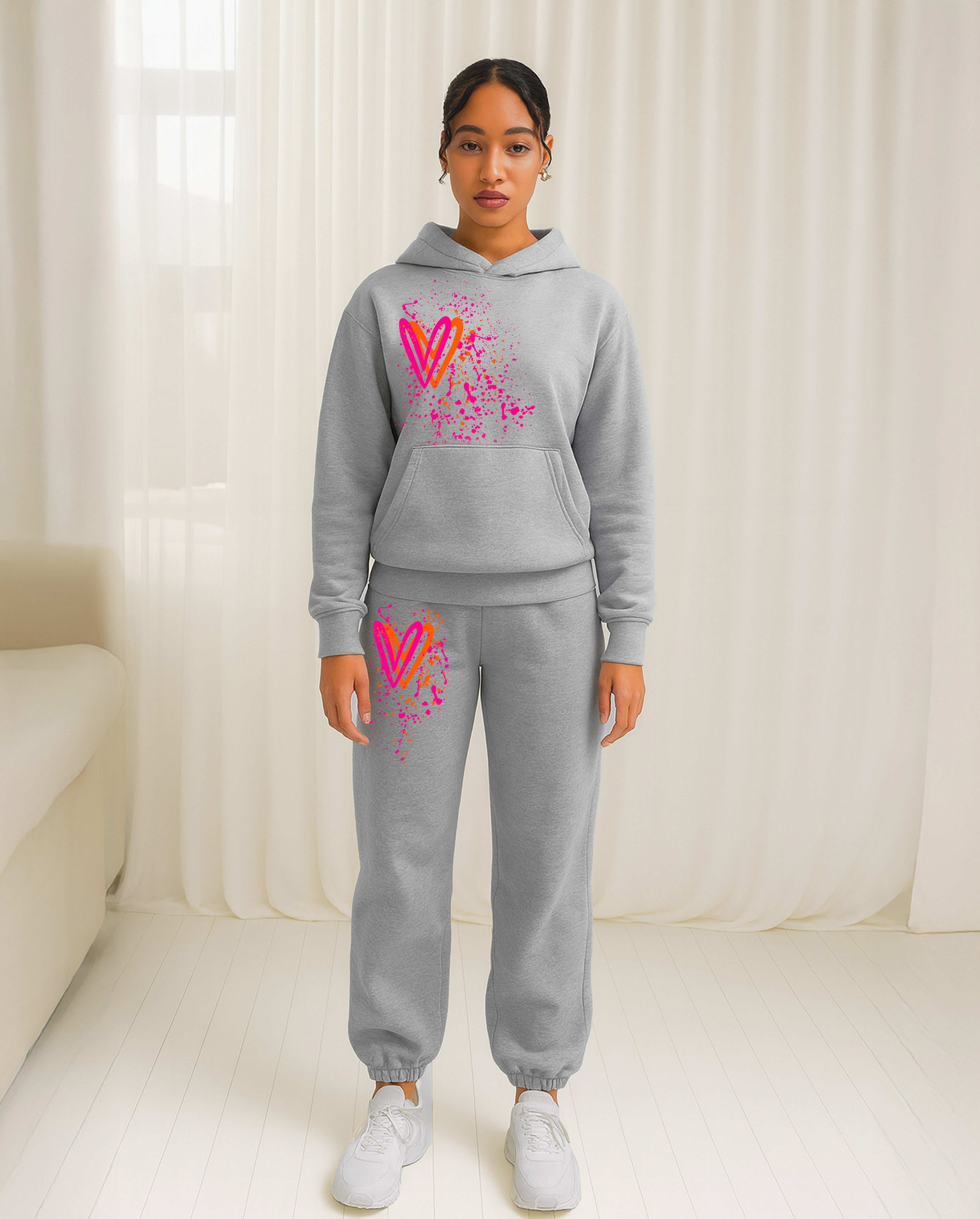 Neon Pink & Orange Hearts Printed Hooded Tracksuit Adult