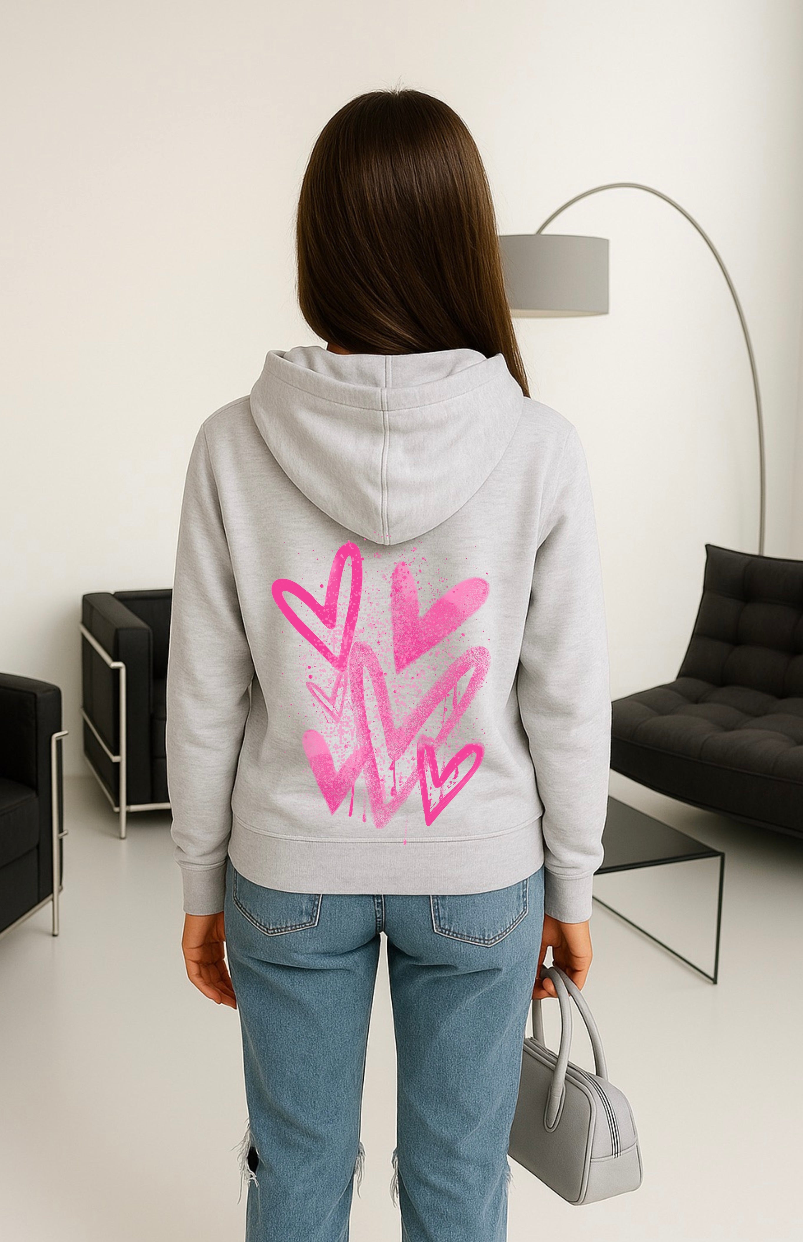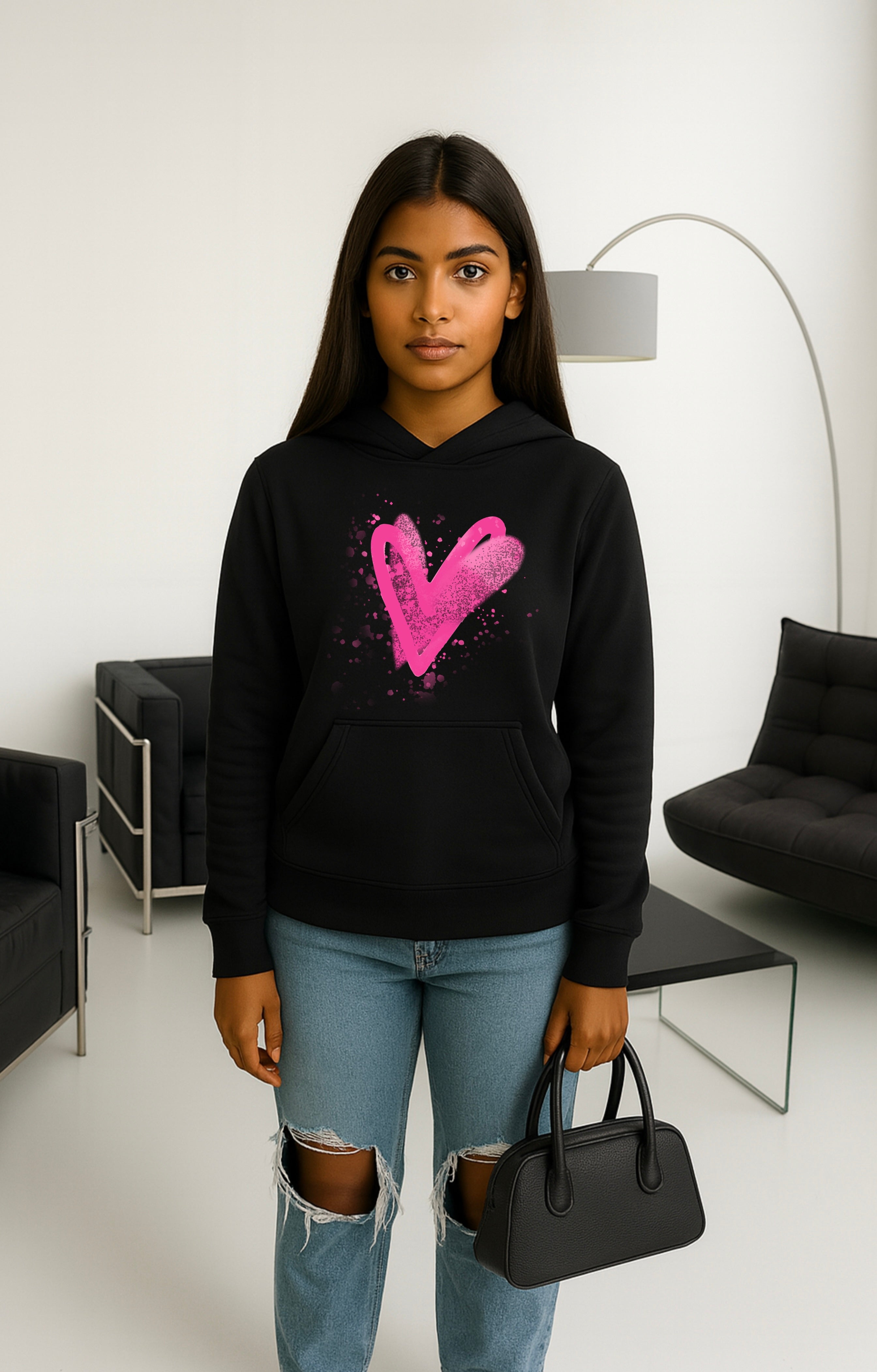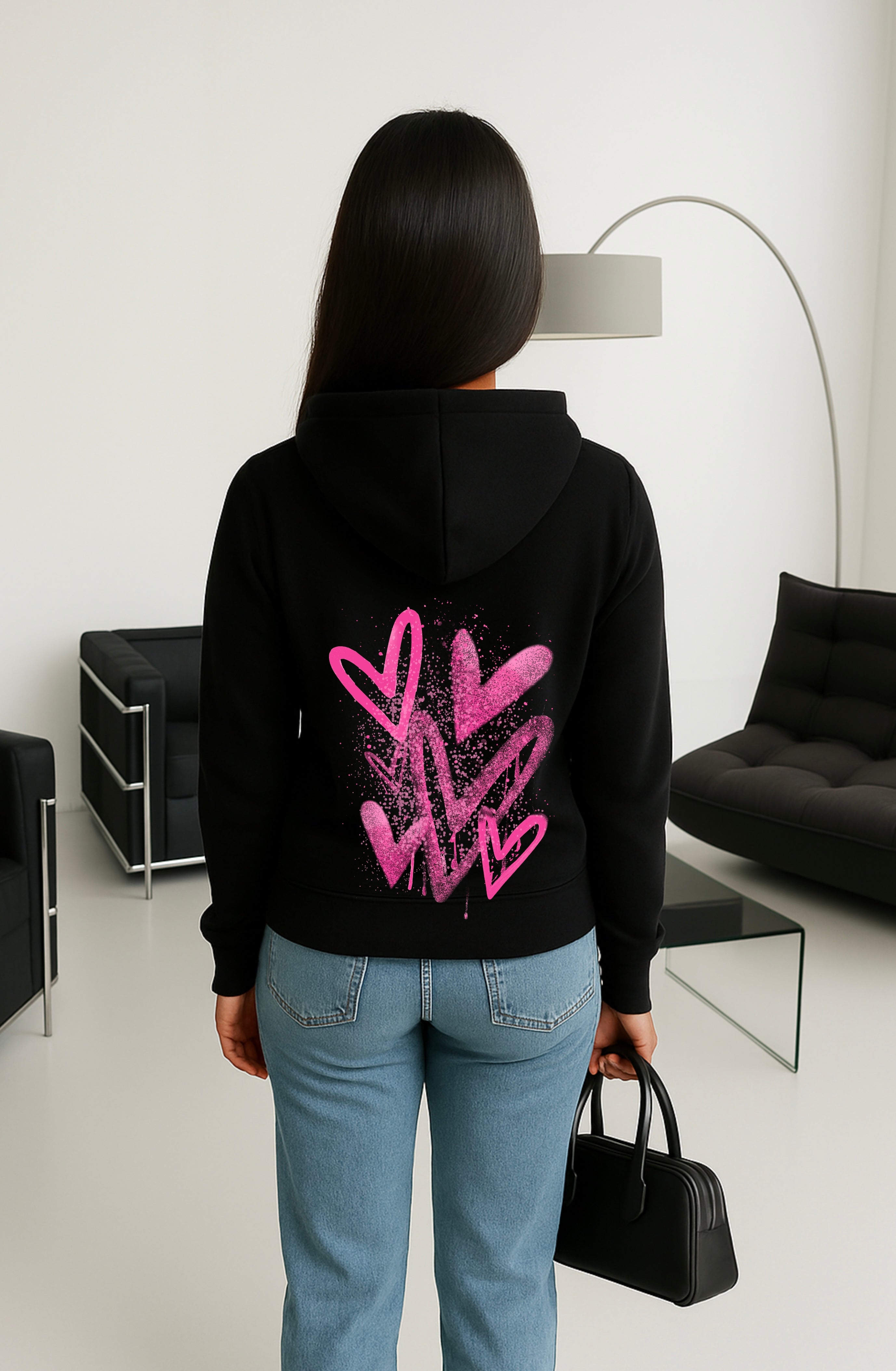 Introducing the Miss Runway graffiti Heart Hoodie, a unique and eye-catching addition to your wardrobe. This Hoodie features a one-of-a-kind design that is sure to turn heads. This Hoodie is perfect for those who want to make a statement with their fashion choices.