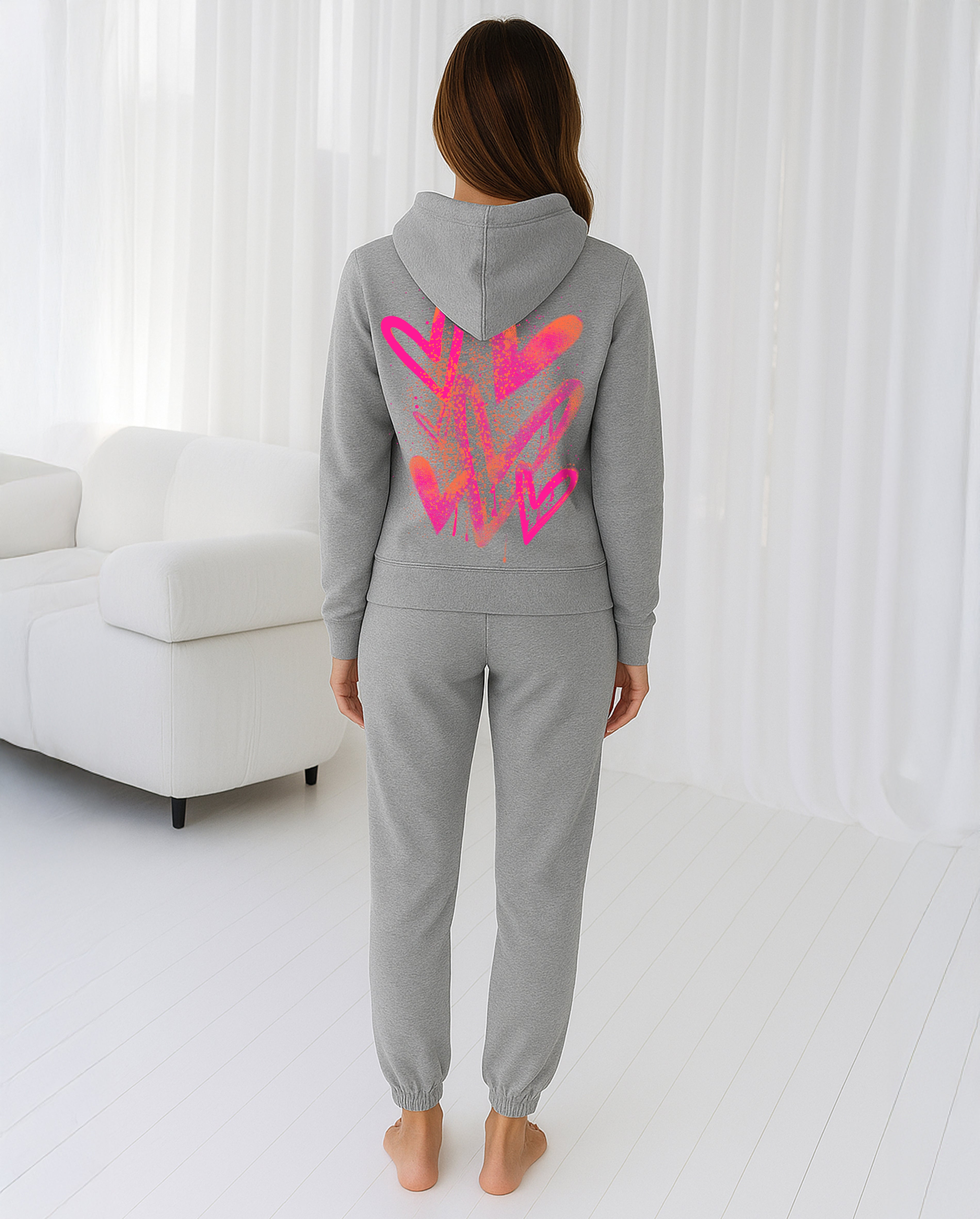 Neon Pink & Orange Scattered Hearts Printed Hooded Tracksuit Adult